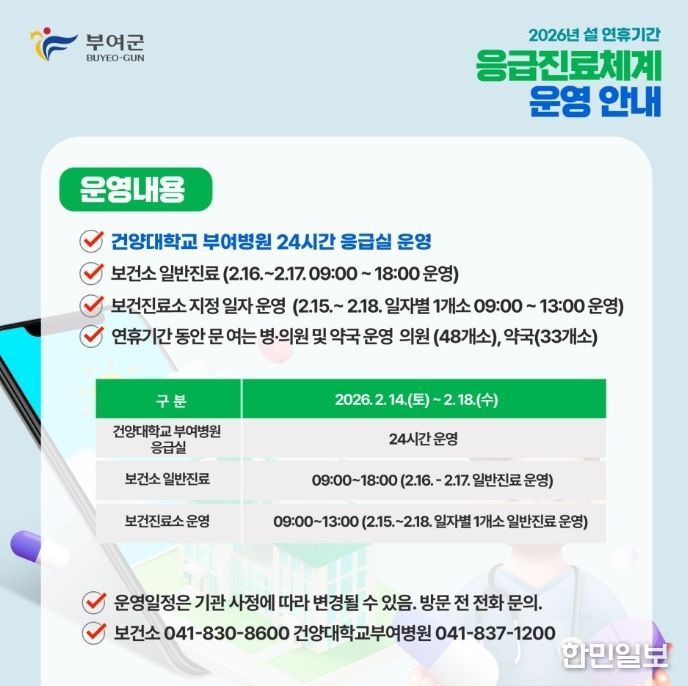 한민일보 서울포커스 유돈상 기자 | 부여군은 다가오는 설 연휴 기간(2월 14일~ 2월 18일) 동안 군민의 의료 공백을 최소화하고 응급상황에 신속하게 대응하기 위해 연휴 응급진료체계를 가동한다고 밝혔다.