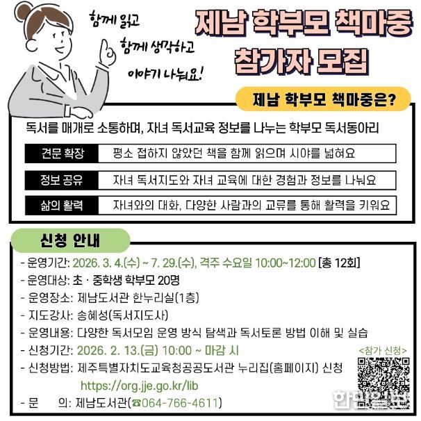 한민일보 서울포커스 임경복 기자 | 제주도교육청 제남도서관은 3월 4일부터 7월 29일까지 지역 초·중학교 학부모들을 대상으로 독서를 통해 삶의 지혜를 나누는 ‘제남 학부모 책마중’ 프로그램을 운영한다.