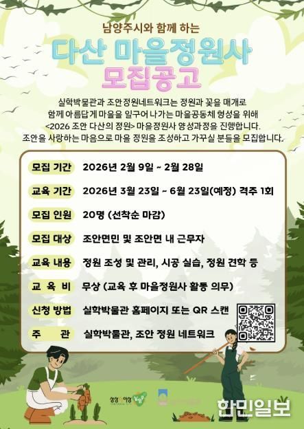 한민일보 서울포커스 김윤이 기자 | 경기문화재단 실학박물관과 조안정원네트워크는 '2026 조안 다산의 정원' 마을정원사 양성과정을 운영한다. '2026 조안 다산의 정원'은 경기도 마을정원 조성사업과 연계해, 실학박물관 다산정원 내 활용도가 낮은 공간에 커뮤니티 정원을 조성하고, 마을정원사 양성을 통해 정원문화를 지역으로 확산하는 것을 목표로 한다.