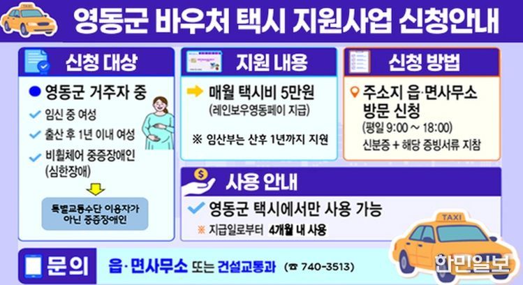 한민일보 서울포커스 김다남 기자 | 충북 영동군은 교통약자의 이동 편의를 높이기 위해 임산부와 비휠체어 중증장애인을 대상으로 ‘바우처 택시 지원사업’을 시행한다고 밝혔다.