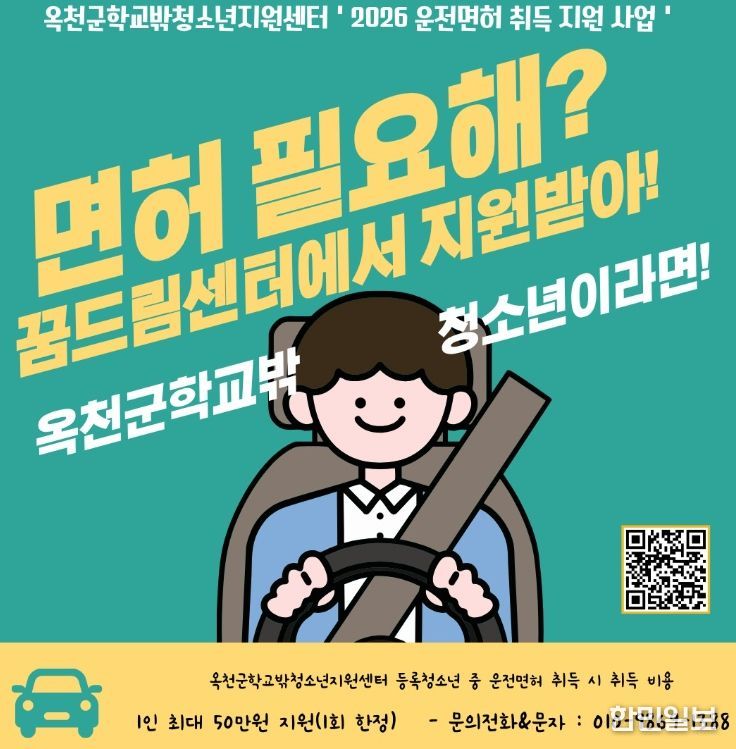 한민일보 서울포커스 김다남 기자 | 옥천군은 2026년부터 학교 밖 청소년을 대상으로 자동차 운전면허 취득비 지원사업을 본격 시행한다고 밝혔다.