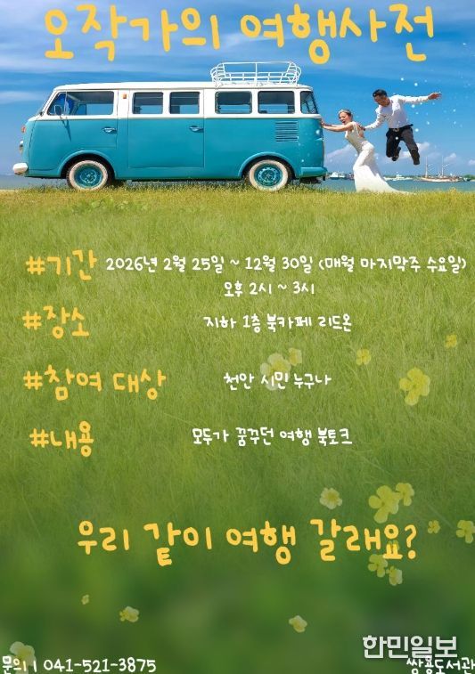 한민일보 서울포커스 황준형 기자 | 천안시 쌍용도서관은 문화가 있는 날을 맞아 여행 강연 프로그램 ‘오작가의 여행 사전’을 운영한다고 19일 밝혔다.