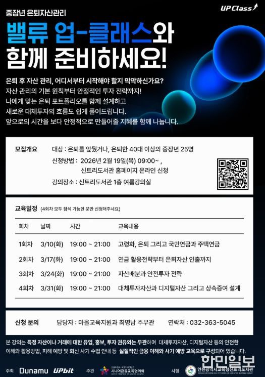 한민일보 서울포커스 유창렬 기자 | 인천광역시교육청신트리도서관은 19일부터 시니어 은퇴자산 관리 교육 ‘자산관리 밸류-업 클래스’ 참여자를 모집한다.