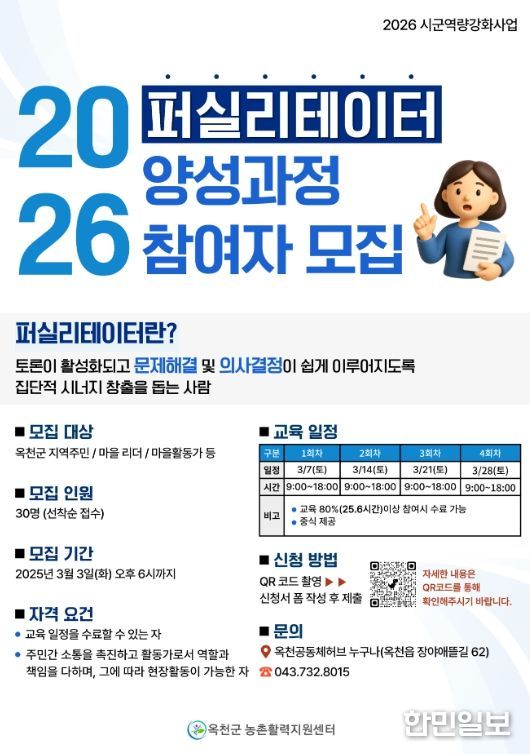 한민일보 서울포커스 김다남 기자 | 옥천군이 2026년 시군역량강화사업의 일환으로 ‘2026년 퍼실리테이터 양성과정’ 교육 참여자를 모집한다.