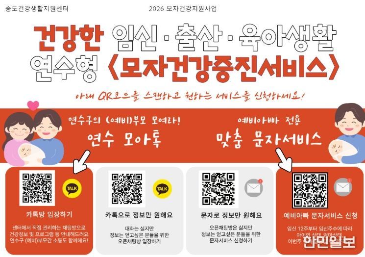 한민일보 서울포커스 백진욱 기자 | 연수구 송도건강생활지원센터는 임산부와 영유아 부모를 위한 임신·육아 정보 소통 창구(플랫폼)인 ‘연수 모아(母兒)톡’을 구축하고, 이달 말부터 연중 운영한다.