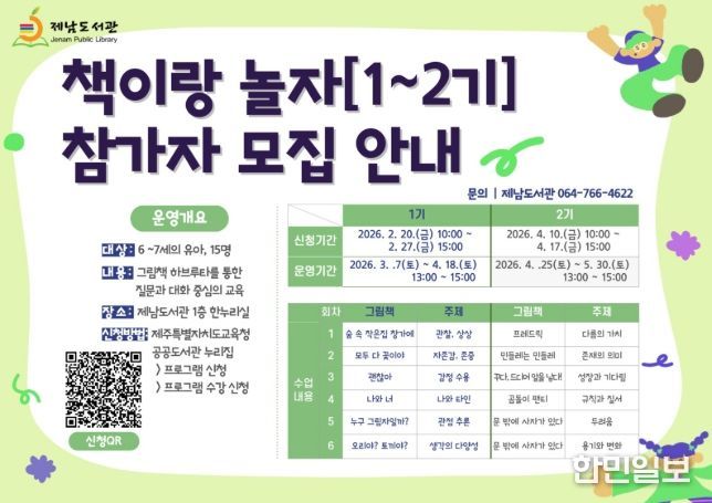 한민일보 서울포커스 임경복 기자 | 제주도교육청 제남도서관은 3월부터 서귀포 관내 6~7세 아동을 대상으로 전문적인 독서 교육과 돌봄을 결합한 ‘책이랑 놀자’ 프로그램 운영을 시작하며 참가자를 모집한다.