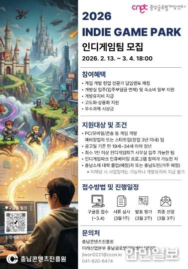 한민일보 서울포커스 박덕환 기자 | 충남콘텐츠진흥원 산하 충남글로벌게임센터가 ‘인디게임파크 인큐베이팅’ 참가자를 모집한다.