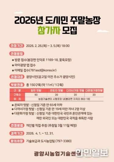 한민일보 서울포커스 임광현 기자 | 광양시는 도심 속에서 농업을 체험하며 가족과 함께 건강한 여가를 보낼 수 있는 ‘2026년 도시민 주말농장’ 참가자를 2월 26일부터 3월 5일까지 모집한다고 밝혔다.