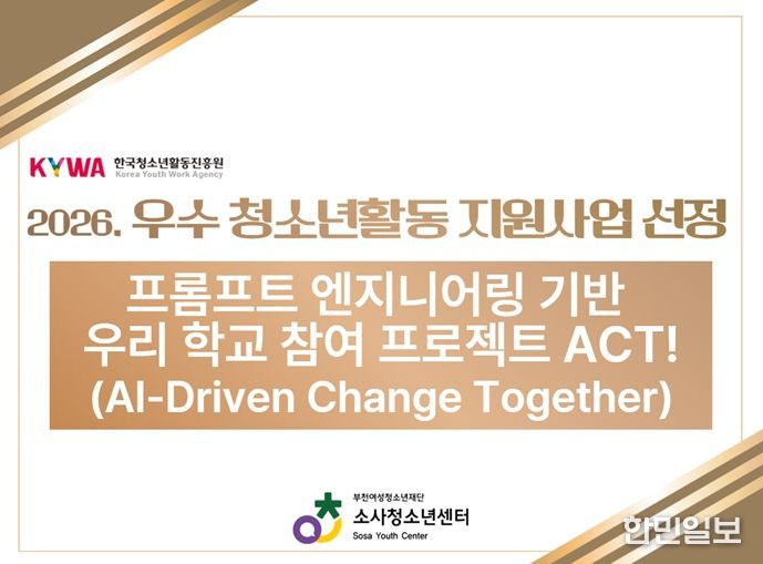 한민일보 서울포커스 김윤이 기자 | 부천여성청소년재단이 운영하는 소사청소년센터는 한국청소년활동진흥원이 주관하는 ‘2026년 우수 청소년활동 프로그램 지원사업’ AI·디지털 분야에 선정됐다고 밝혔다.