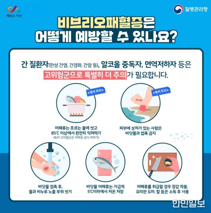 예방 수칙은 ▲어패류 반드시 익혀 먹기 ▲피부에 상처가 있는 사람은 바닷물과 접촉 피하기 ▲생굴이나 어패류 취급 시 장갑 착용 등이다.