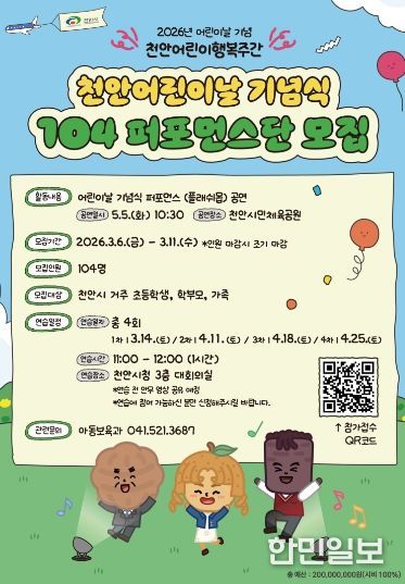 한민일보 서울포커스 황준형 기자 | 천안시는 제104회 어린이날을 맞아 기념식 무대를 함께 꾸밀 ‘104 퍼포먼스단’을 모집한다고 6일 밝혔다.