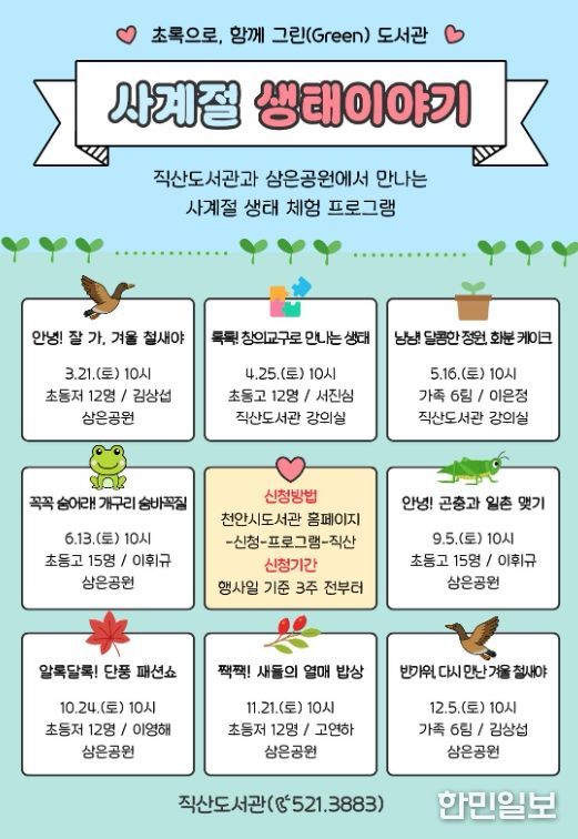 한민일보 서울포커스 황준형 기자 | 천안시 직산도서관은 생애주기별 맞춤 생태 체험 프로그램 ‘사계절 생태이야기’를 운영한다고 6일 밝혔다.