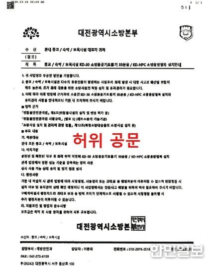 대전소방본부 관계자는 “최근 공공기관을 사칭한 범죄가 전국적으로 발생하고 있는 만큼 각별한 주의가 필요하다”며 “특히 종교시설, 숙박시설, 보육시설 등 시설 관계자들은 소방 관련 물품 구매 요청을 받을 경우 응하지 말고 즉시 관할 소방관서에 사실 여부를 확인해 피해를 예방해 달라”고 말했다.