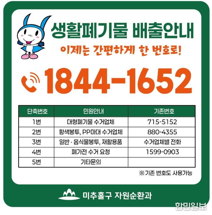 한민일보 서울포커스 백진욱 기자 | 인천 미추홀구가 주민들의 생활폐기물 배출 편의를 획기적으로 개선하기 위해 ‘생활폐기물 대표번호 자동응답 서비스(1844-1652)’를 3월부터 본격 시행한다고 밝혔다.
