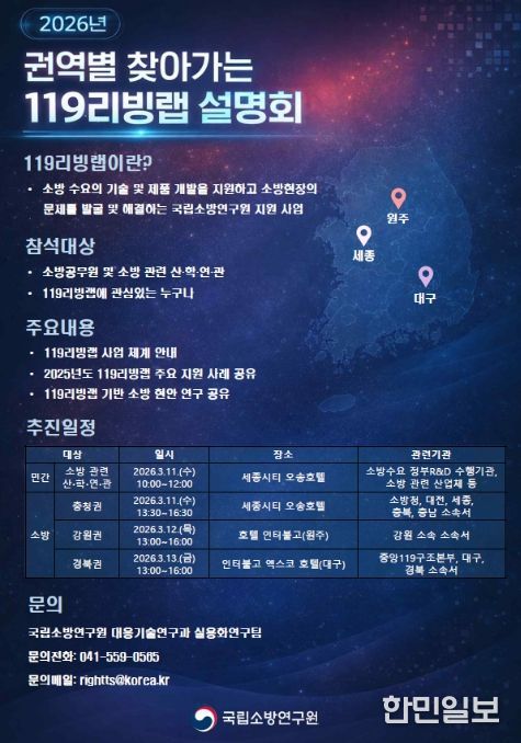 한민일보 서울포커스 최성훈 기자 | 소방청이 국립소방연구원이 소방 기술과 제품이 실제 재난 현장에 효과적으로 적용될 수 있도록 지원하는 ‘119리빙랩(Living Lab) 사업 설명회’를 3월 11일부터 13일까지 3일간 총 네 차례에 걸쳐 개최한다고 밝혔다.