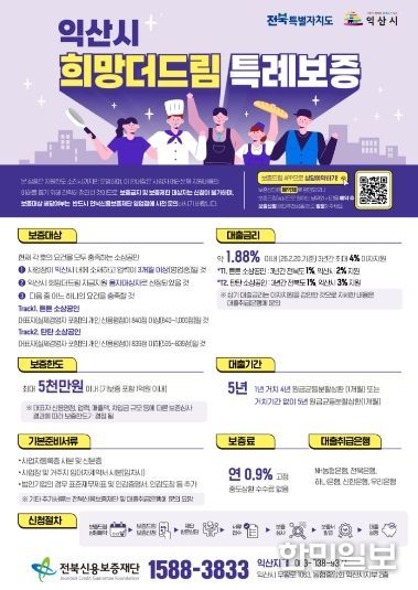 익산시는 오는 9일부터 총 175억 규모의 '소상공인 희망더드림 특례보증' 사업을 본격 추진한다고 6일 밝혔다.