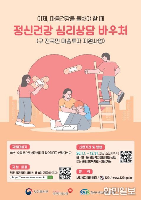 김철영 건강증진과장은 “정신건강 문제는 누구나 겪을 수 있는 만큼 조기에 상담과 도움을 받는 것이 중요하다”며, “심리적 어려움을 겪는 시민들이 심리상담 서비스를 통해 도움을 받길 바란다”고 말했다.