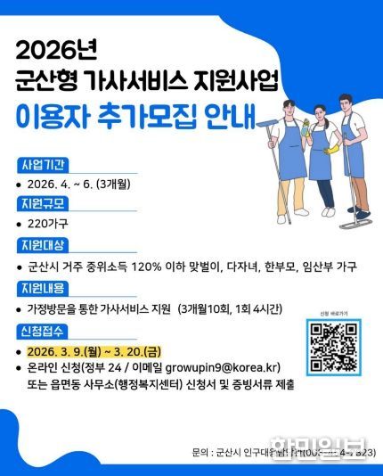 한민일보 서울포커스 김용택 기자 | 군산시가 가사 부담을 겪는 가정을 지원하기 위해 ‘군산형 가사서비스 지원사업’의 상반기 이용자를 추가 모집한다.