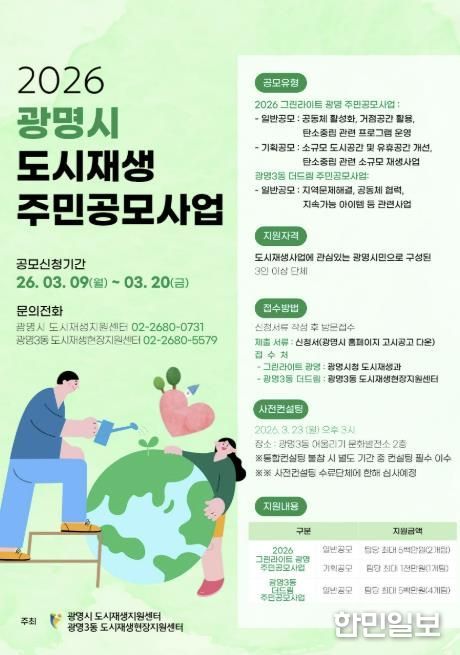 한민일보 서울포커스 임광현 기자 | 광명시가 오는 20일까지 주민이 스스로 마을 문제를 해결하고 공동체 활성화를 이끌어갈 ‘2026년 도시재생 주민공모사업’ 참여단체를 모집한다.