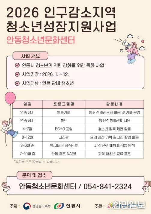 한민일보 서울포커스 김봉순 기자 | 성평등가족부와 안동시가 지원하고 안동청소년문화센터가 주관하는 ‘2026 인구감소지역 청소년성장지원’ 사업이 지난해에 이어 2년 연속 운영된다.