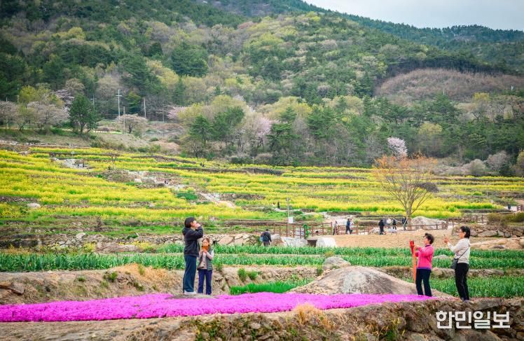 층층이 쌓인 계단식 논에 유채꽃이 흐드러지게 피어, 남해 특유의 지형과 바다가 만들어낸 이색적인 봄 풍경을 배경으로 '인생 사진'을 남기려는 관광객들의 발길이 이어지고 있다.