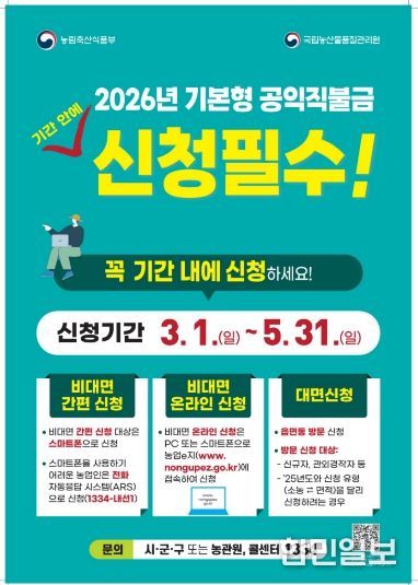 한민일보 서울포커스 김봉순 기자 | 문경시는 농업인의 소득 안정을 위한 ‘2026년 기본형 공익직접지불금’신청을 3월 1일부터 5월 31일까지 농지 소재지 읍·면·동 행정복지센터 방문 또는 스마트폰, 인터넷, ARS를 통해 받는다.