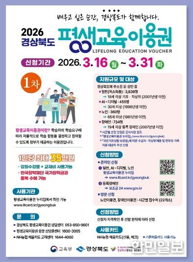 한민일보 서울포커스 임경복 기자 | 고령군은 군민의 자아실현과 평생학습 기회 확대를 위해 오는 3월 16일부터 31일까지 '2026년 고령군 평생교육 이용권 지원사업' 신청을 접수한다고 밝혔다.