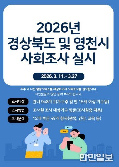 한민일보 서울포커스 김봉순 기자 | 영천시는 11일부터 27일까지 ‘2026년 경상북도 및 영천시 사회조사’를 실시한다고 밝혔다.