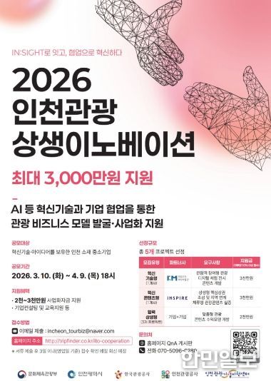 한민일보 서울포커스 유창렬 기자 | 인천광역시와 인천관광공사(사장 유지상, 이하 공사)는 지역 관광 활성화와 관광기업 성장 지원을 위해 '2026년 인천관광 상생이노베이션'사업의 참여기업을 모집한다고 밝혔다.