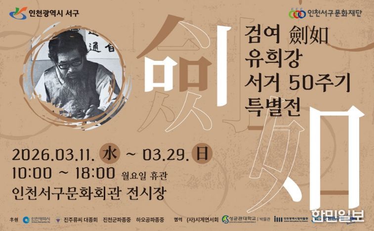 한민일보 서울포커스 김용택 기자 | (재)인천서구문화재단은 오는 3월 11일부터 3월 29일까지 인천서구문화회관 전시장에서 ‘검여 유희강 선생 50주기 기념 특별전’을 개최한다.