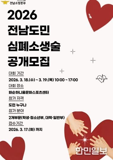 한민일보 서울포커스 최성훈 기자 | 전남소방본부가 도민의 응급상황 대처 능력을 높이고 생명 존중 문화를 확산하기 위해 오는 3월 17일까지 ‘제15회 일반인 심폐소생술 경연대회’ 참가팀을 전격 모집한다.