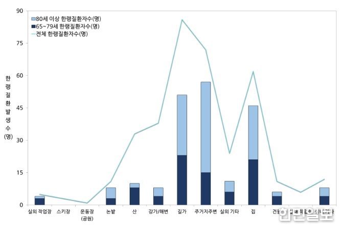 발생 연령과 발생 장소의 연관성을 비교해 보면, 가장 많은 한랭질환자 발생 분포를 띄는 65세 이상 연령층(209명)의 주요 증상 발생 장소가 주거지 주변(27.3%, 57명), 길가(24.4%, 51명), 집(22.0%, 46명)으로, 노년층의 일상생활 속 한랭질환 예방이 중요함을 나타내고 있다.