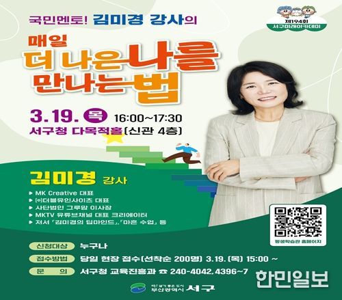 ‘서구미래아카데미’는 주민들의 자기 계발과 삶의 질 향상을 위해 다양한 분야의 명사를 초청해 운영하는 인문·교양 프로그램으로, 매회 높은 관심과 호응을 얻고 있다. 특히 이번 강연은 자기 성장과 마음 관리에 관심 있는 주민들에게 의미 있는 시간이 될 것으로 기대된다.