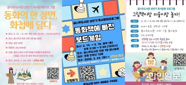 또한 ‘동화책에 빠진 보드게임’ 프로그램은 오는 3월 14일부터 5월 16일까지 매주 토요일 오후 3시 30분부터 5시 30분까지 총 10차시로 운영된다. 동화책을 읽고 이야기를 나눈 뒤 내용과 연계된 보드게임을 배우며 자연스럽게 독서에 대한 흥미를 높일 수 있도록 구성됐다. 대상은 초등학생 전 학년 12명이며 별도의 재료비는 없다.