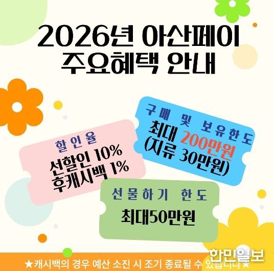 아산시 관계자는 “최근 국제 정세 불안과 물가 상승으로 시민 생활 부담이 커지고 있는 만큼, 아산페이를 상반기에 집중 발행해 가계 부담 완화와 지역 내 소비 진작에 실질적인 도움이 되도록 하겠다”며 “앞으로도 아산페이가 시민 생활 안정과 소상공인 매출 회복에 기여하는 대표 민생정책이 되도록 안정적으로 운영하겠다”고 말했다.