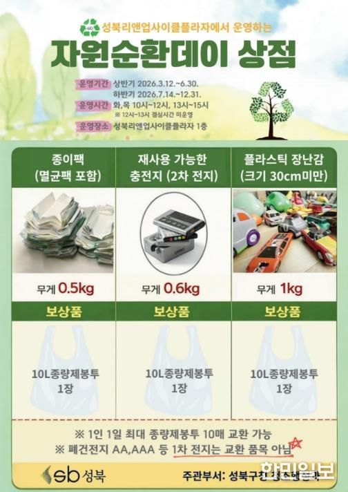 한민일보 서울포커스 김봉순 기자 | 서울 성북구가 주민들의 자원 순환 참여를 촉진하고 올바른 분리배출 문화를 확산하기 위해 3월 12일부터 성북리앤업사이클플라자 1층에서 ‘자원순환데이 상점’을 운영한다.