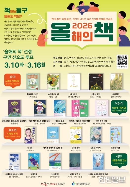 한민일보 서울포커스 임경복 기자 | 광주 동구는 ‘2026 책 읽는 동구, 올해의 책’ 선정을 위한 구민 선호도 투표를 오는 16일까지 실시한다고 밝혔다.