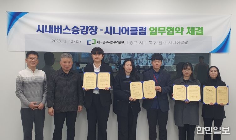 한민일보 서울포커스 김봉순 기자 | 대구공공시설관리공단(이사장 문기봉) 시내버스유개승강장은 지난 3월 10일(화), 시내버스유개승강장 사무실에서 지역 4개 시니어클럽과 업무협약을 체결했다.