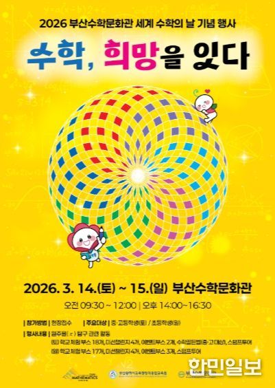한민일보 서울포커스 임광현 기자 | 부산광역시교육청창의융합교육원은 오는 14일과 15일 이틀간 부산진구 부전동 부산수학문화관에서 학생들을 대상으로 ‘수학, 희망을 잇다’ 행사를 개최한다.