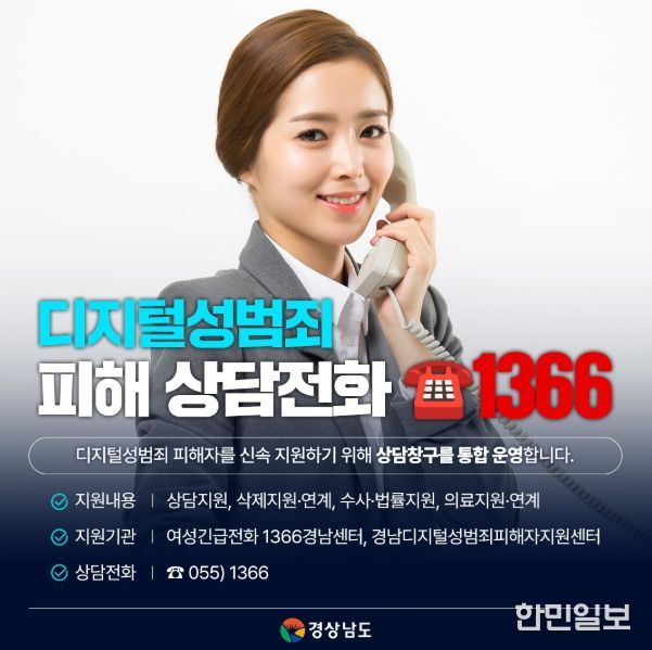 디지털 성범죄 피해가 발생하면 여성긴급전화 1366을 통해 24시간 상담과 긴급 지원을 받을 수 있다. 초기 상담 이후 전문기관으로 즉시 연계돼 삭제지원과 상담, 수사·법률 지원 등 맞춤형 피해 지원이 이뤄진다.