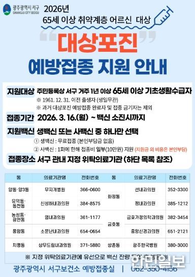 한민일보 서울포커스 임경복 기자 | 광주광역시 서구는 대상포진 발병 위험이 높은 고령층의 건강 보호를 위해 오는 16일부터 ‘대상포진 예방접종 지원사업’을 추진한다.