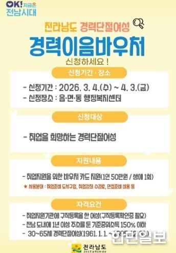 한민일보 서울포커스 박정민 기자 | 전라남도는 출산과 육아 등으로 직장을 그만둔 후 재취업에 어려움을 겪는 경력단절 여성을 대상으로 ‘경력이음바우처’ 이용자를 모집한다고 밝혔다.