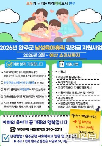 13일 완주군은 남성 근로자의 육아휴직 사용을 독려하고 자녀 양육에 따른 경제적 부담을 덜어주고자 ‘2026년 남성 육아휴직 장려금 지원사업’을 본격적으로 추진한다고 밝혔다.