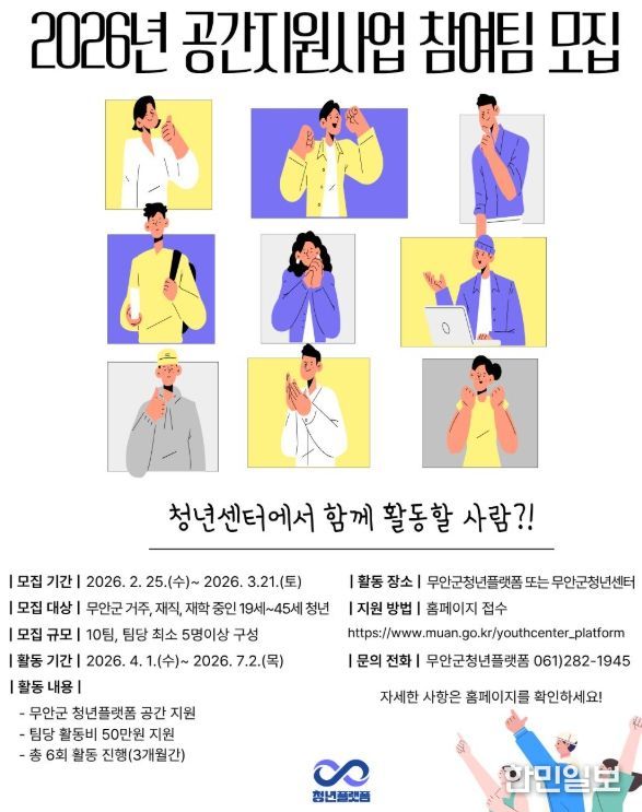 한민일보 서울포커스 박용남 기자 | 무안군청년플랫폼은 청년들의 다양한 모임 활동을 지원하고 청년센터 공간 활용을 활성화하기 위해 ‘2026년 공간지원 사업’ 참여팀을 모집한다고 밝혔다.