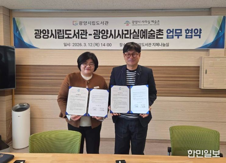 한민일보 서울포커스 임광현 기자 | 광양시립도서관과 광양시사라실예술촌은 지난 3월 12일 오후 2시 광양중앙도서관에서 시민의 문화예술 향유 기회를 넓히고 지역 문화기관 간 협력 기반을 강화하기 위한 업무협약을 체결했다.