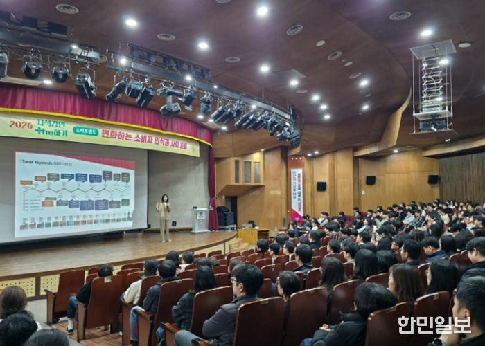 권정윤 강사는 2026년 대한민국 소비 흐름의 주요 특징을 설명하며 ‘트렌트코리아’에서 제시한 핵심 키워드를 중심으로 사회 변화 흐름을 소개했다. 이어 소비 성향과 생활 방식의 변화가 사회와 산업 전반에 미치는 영향을 다양한 사례를 통해 설명했다.