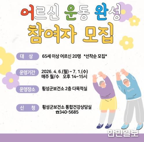 횡성군은 오는 16일부터 10일간 65세 이상 주민을 대상으로 ‘어르신 운동 완성’ 프로그램 참여자 20명을 선착순 모집한다고 밝혔다.