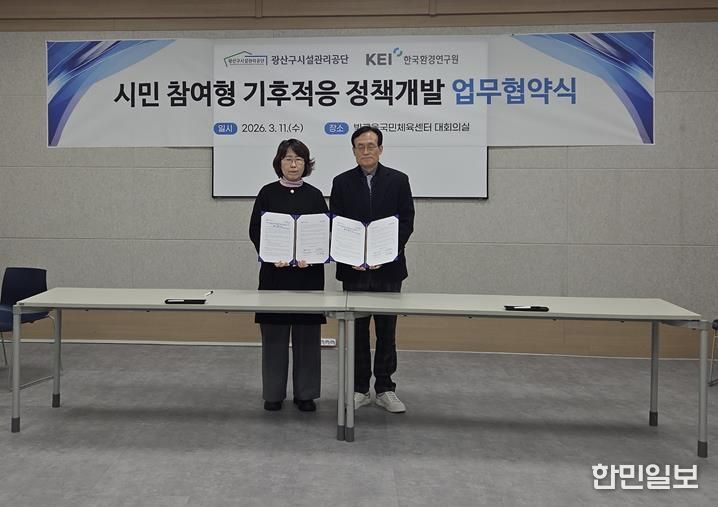 한민일보 서울포커스 임경복 기자 | 광주광역시광산구시설관리공단은 3월 11일 한국환경연구원(KEI) 기후체제 대응 환경 기술개발 연구단과‘시민 참여형 기후적응 최적화를 위한 시민·사회·경제·환경 데이터 분석을 통한 정책 평가기술 개발’사업의 원활한 추진을 위한 업무협약(MOU)을 체결했다고 밝혔다.