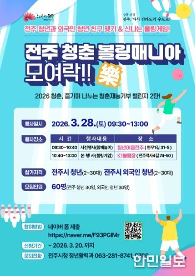 시는 오는 28일 오전 9시 30분, 전주지역 청년과 전주에서 거주하는 외국인 청년 등 60여 명이 함께하는 ‘청춘 볼링매니아 모여락(樂)!’ 행사를 개최한다.