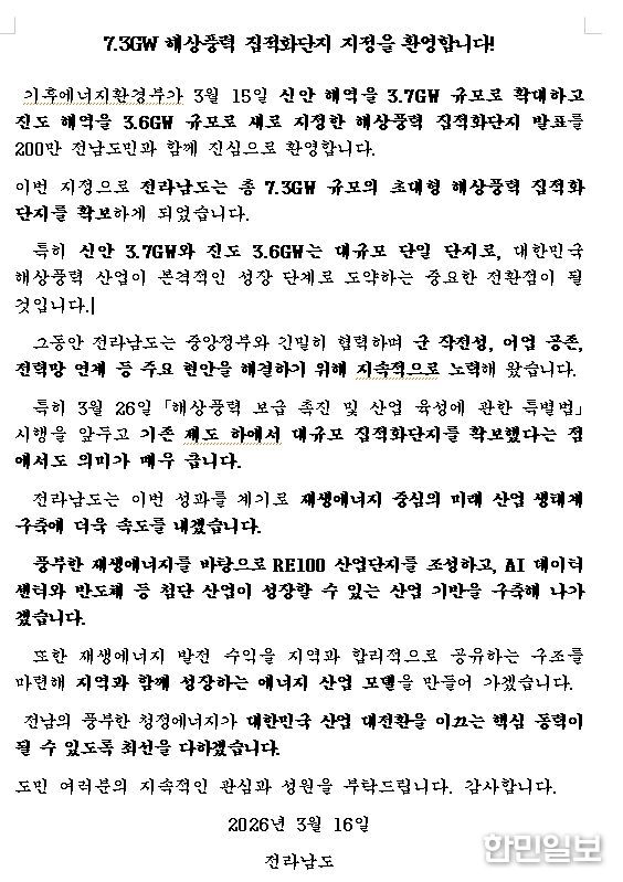 한민일보 서울포커스 박용남 기자 | 전라남도는 기후에너지환경부가 심의·의결해 발표한 전남지역 7.3GW 해상풍력 집적화단지 지정 결과에 대해 환영하고, 앞으로 재생에너지 중심의 미래 산업 생태계 구축에 속도를 내겠다고 다짐했다.